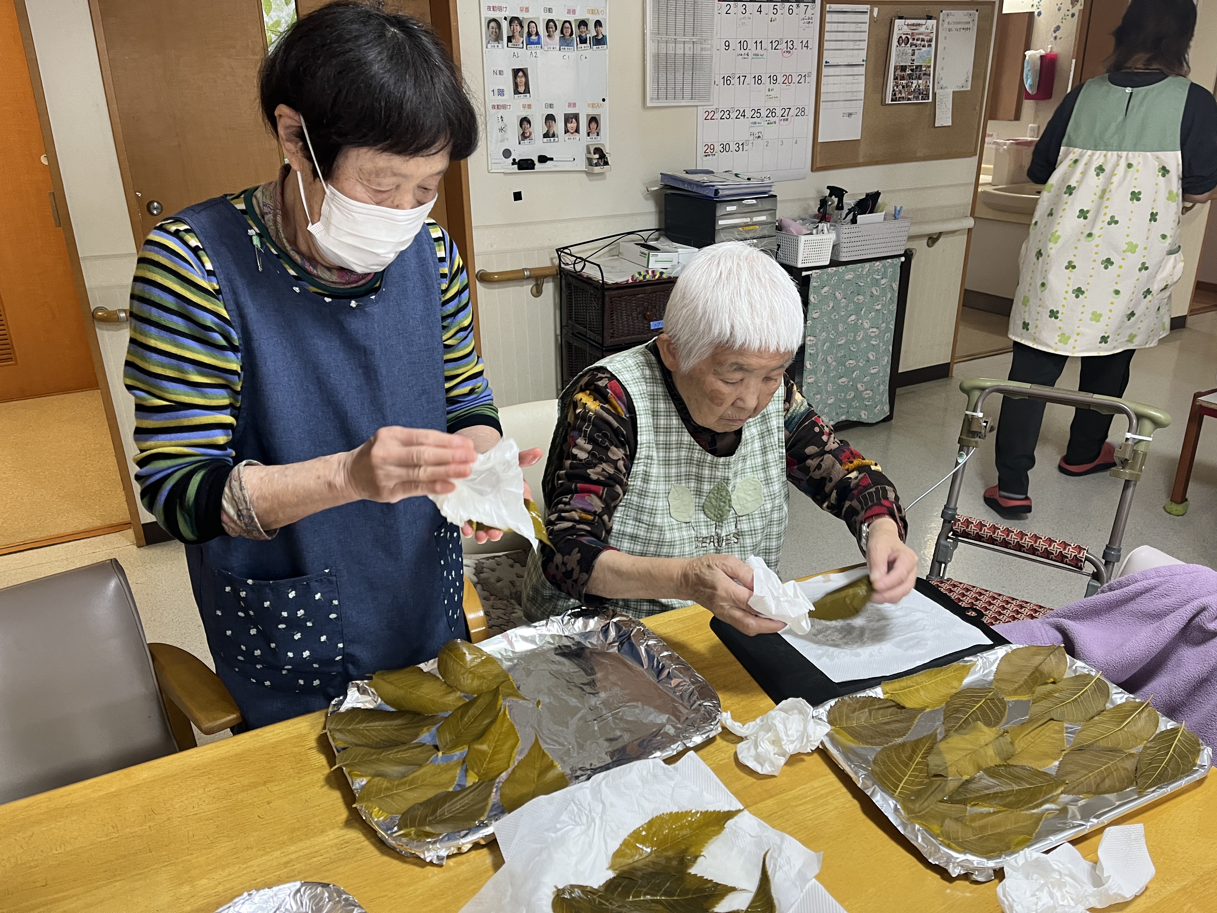 粉を混ぜて、桜の葉っぱを洗って拭いて