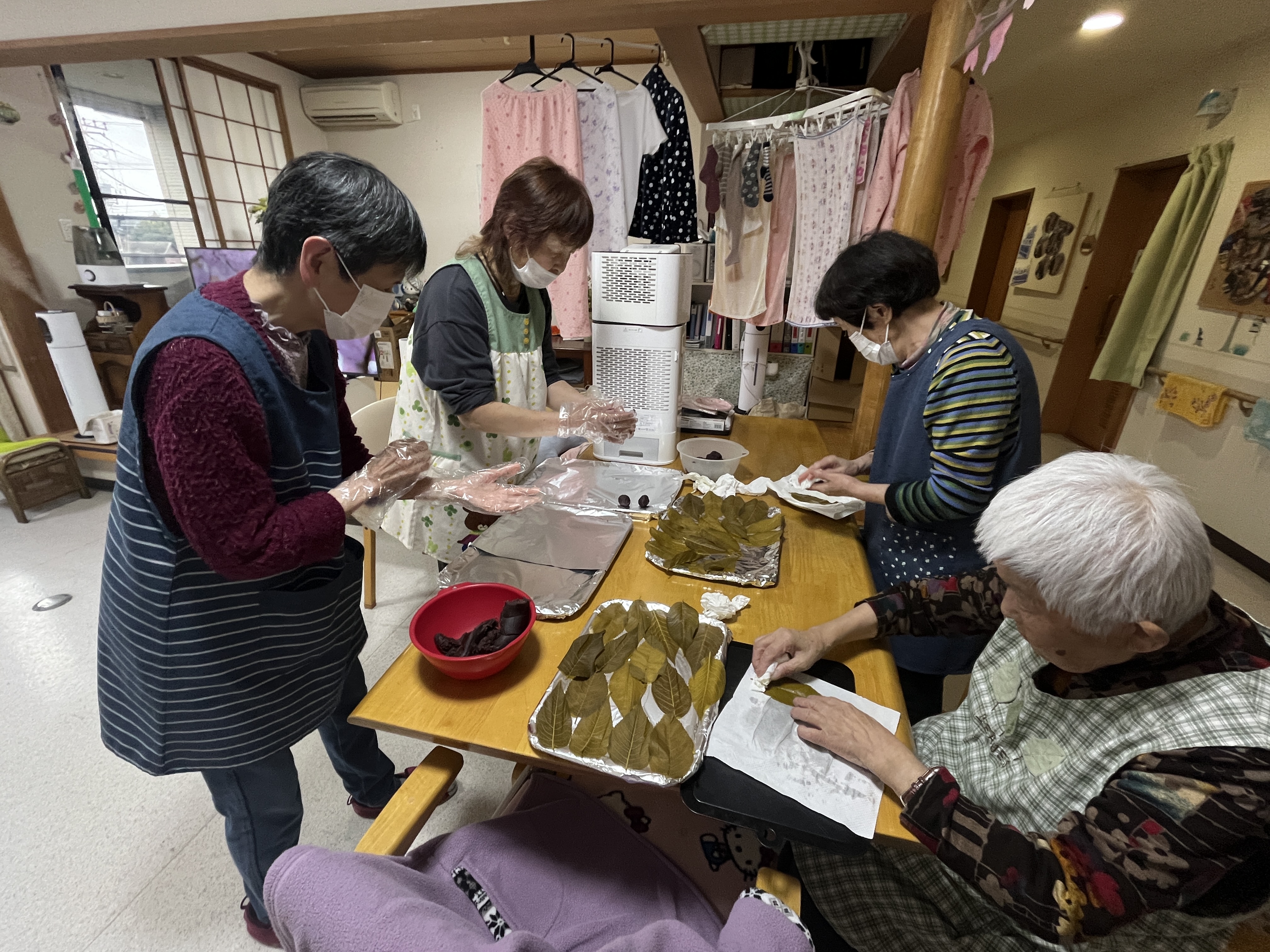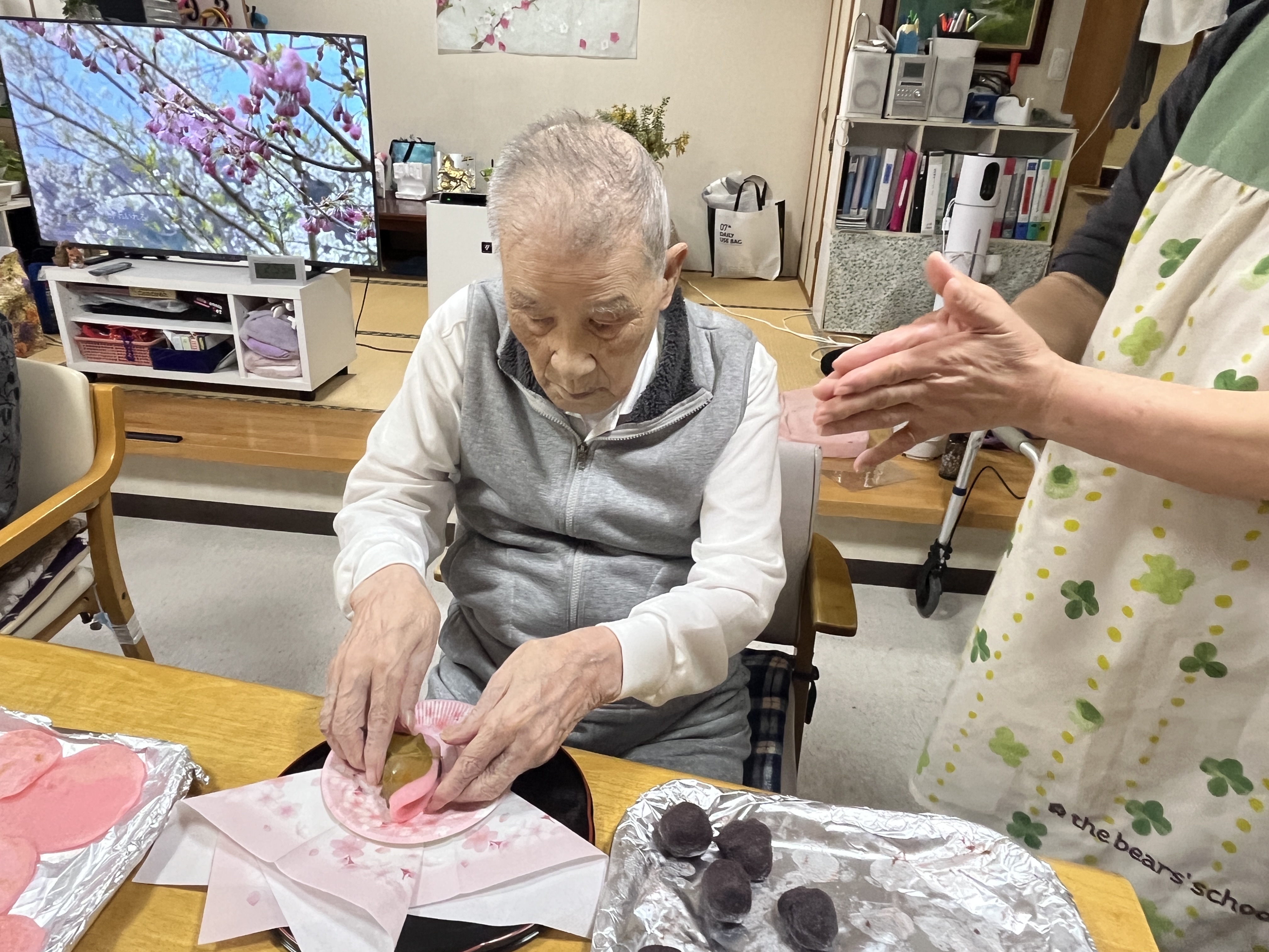 自分の食べる桜餅を一生懸命作ります